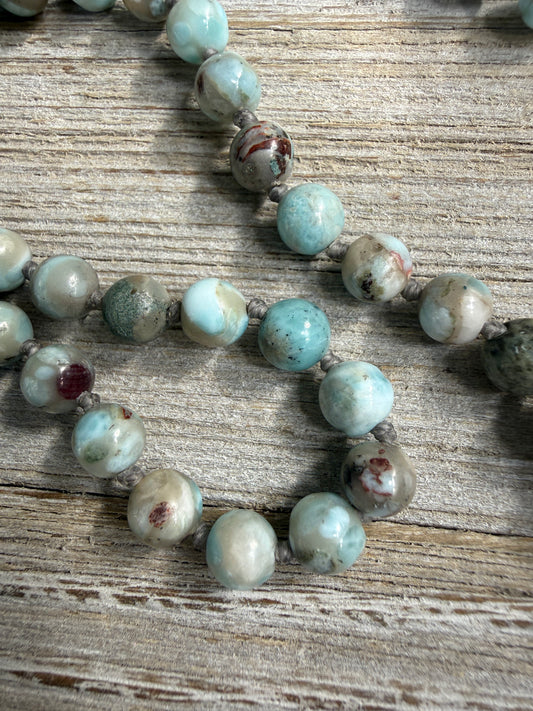 Blue larimar knotted necklace with sterling clasp and sterling ganesha pendant. 17”.