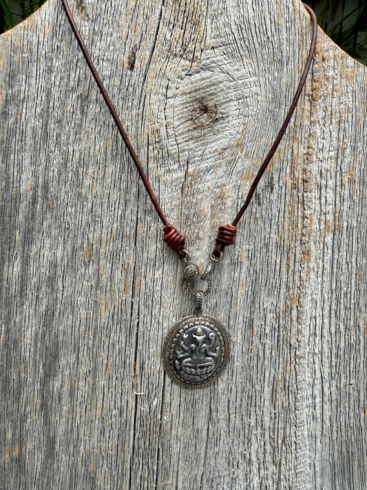 Pavé diamond Ganesh on chocolate leather with diamond clasp/charm holder. 17” leather; 1.5” Ganesh.