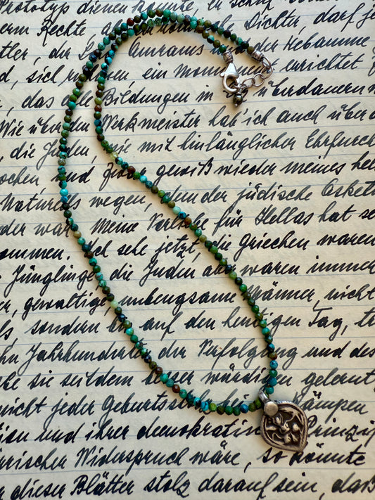 Old sterling silver Tibetan pendant on faceted variegated turquoise necklace. 15.5-16”