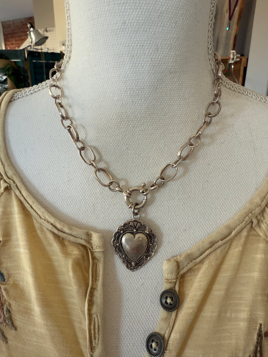 Navajo style sterling pendant on fine silver chain necklace. Sterling silver clasp/charm holder. 18”