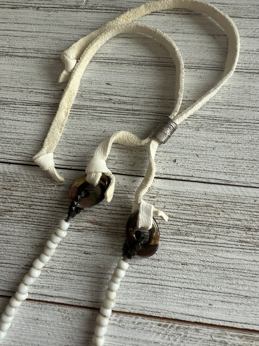 Pearls knotted on brown leather with an optional brown leather tassel necklace. Handmade by ladeDAH! Jewelry. Boho pearls!