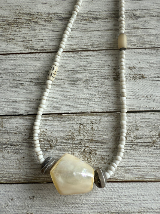 Mother of pearl carved cross on faceted moonstone short necklace. 18”