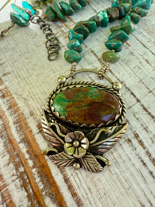 Tibetan turquoise pendant with leaves and flowers on turquoise chunks necklace. 17.5”-20”