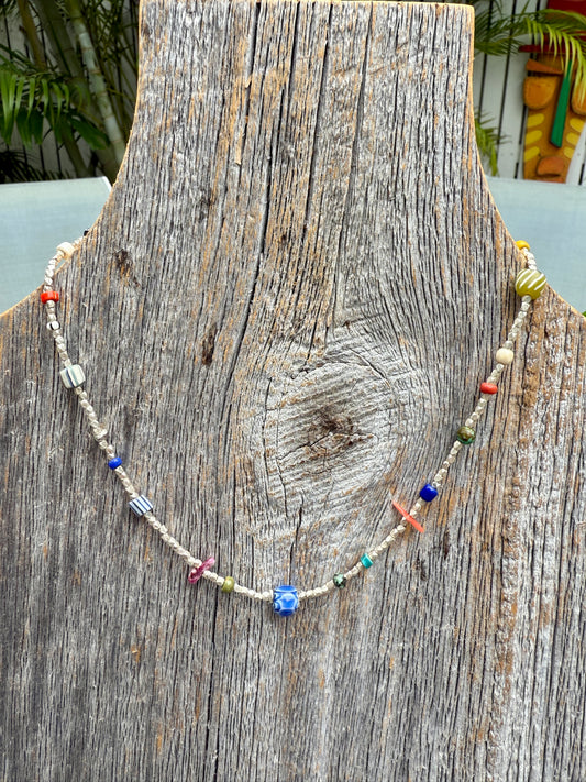 Tiny fine silver beads with assorted glass and gemstone beads choker necklace. 15-16.75”