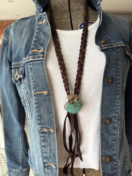 Tibetan turquoise heart on braided deerskin leather necklace. 32”.