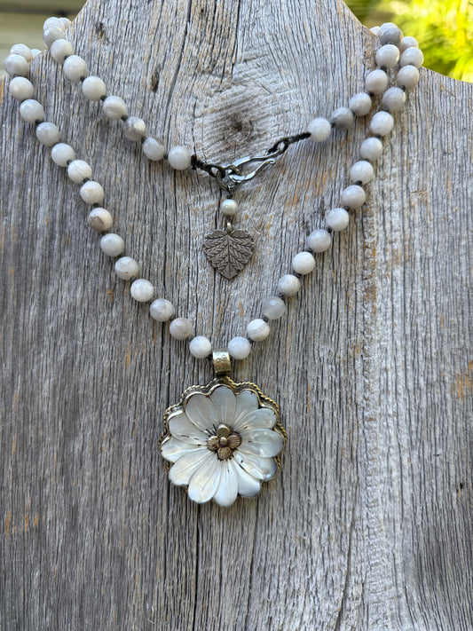 Tibetan mother of pearl daisy pendant on knotted white agates with leaf dangle; long necklace. 35”.