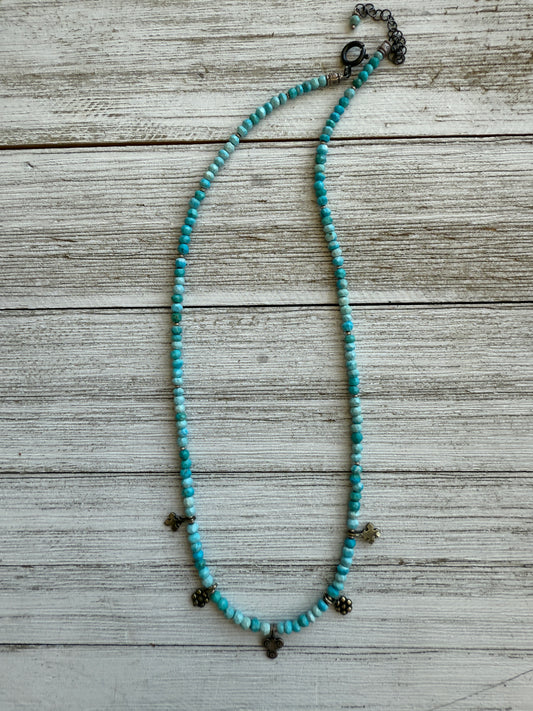 Tiny sterling charms nestled among blue turquoise and fine silver spacers necklace.
