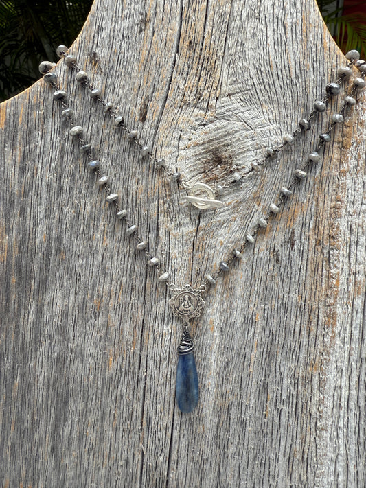 Wire wrapped blue kyanite with a sterling silver religious medal connector on grey silverite chain necklace. 28” chain additional 2.25” pendant and stone.