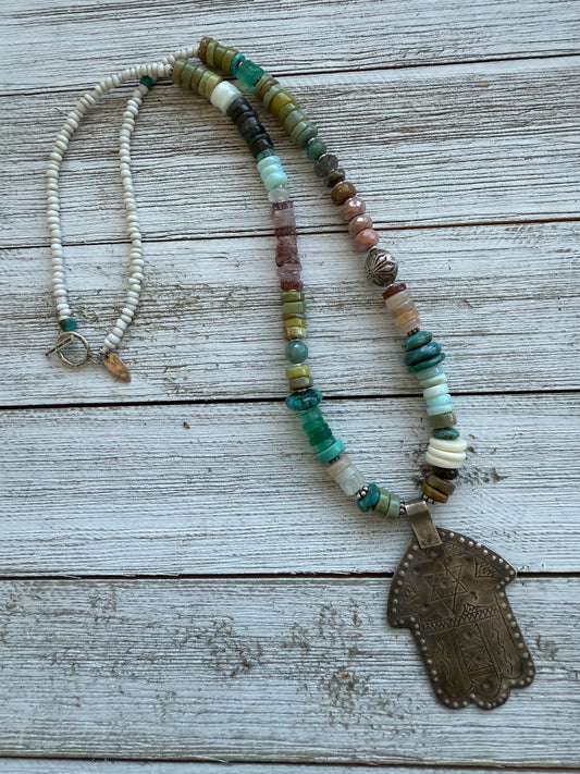 Very old Ethiopian hamsa made from old Sterling on turquoise, moonstone, bumblebee jasper necklace.
