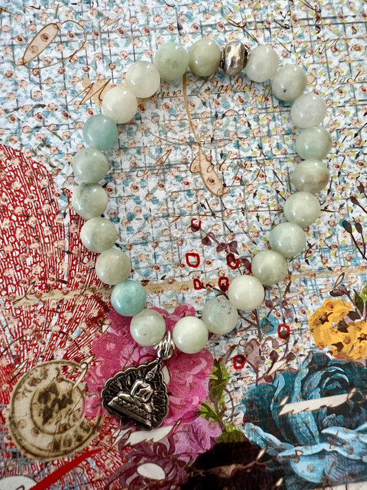 Bracelet of faceted aquamarines with a solid sterling silver sitting Buddha charm.
