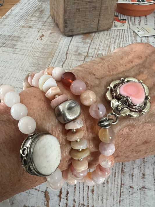 Heishi cut pink opals surround a fine silver pinched cube. Fine silver spacers. 6” stretch stack bracelet.