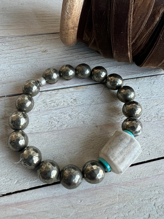 Faceted pyrite beads surround an antler with two turquoise accent beads. Stretch bracelet fits most at 6.5”.