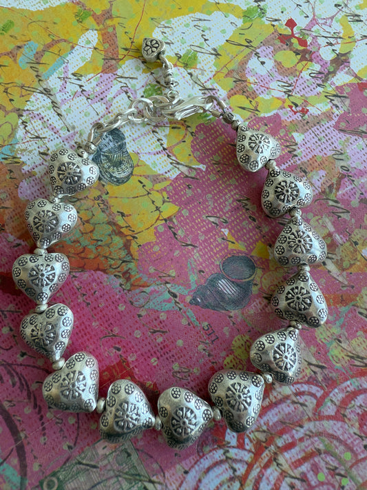 Fine silver stamped heart bracelet with extender chain. 7.5-8.5”