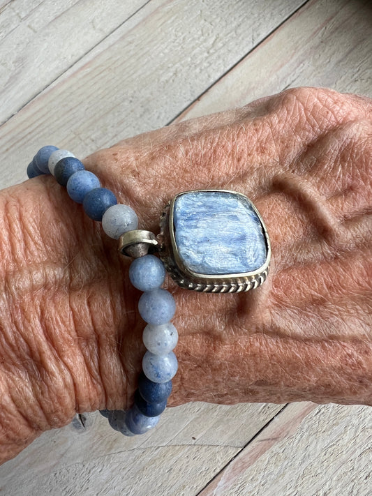 Tibetan blue kyanite pendant suspended from matte blue aventurine stack stretch bracelet. 7”