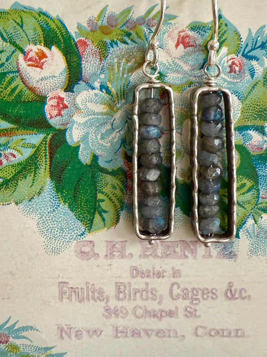 Labradorite in fine silver frames on fine silver ear wires. Earrings.