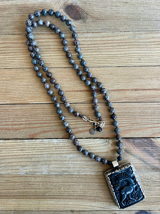 Tibetan carved bone horse pendant on knotted coffee Jasper. 37” Wear long or doubled.