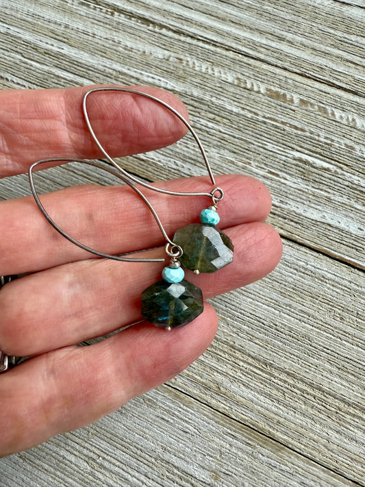 Faceted labradorite and turquoise dangle earrings on sterling ear wires.