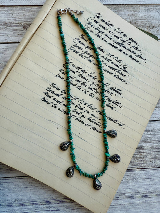 Paisley charms on turquoise choker necklace. 15.5-16.5”
