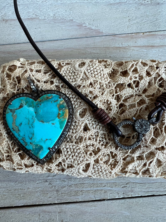 Pavé diamond turquoise heart on leather with diamond clasp/charm holder. 18”. Boho luxe necklace.