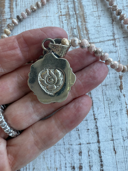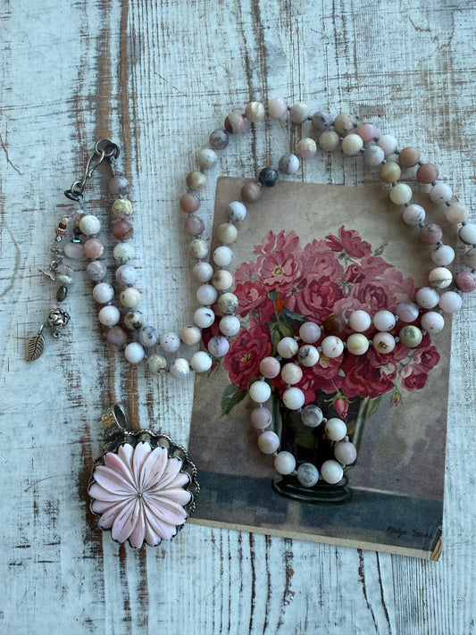 Hand carved pink Opal Tibetan rose pendant hand knotted onto cherry blossom agates necklace. 34” long.