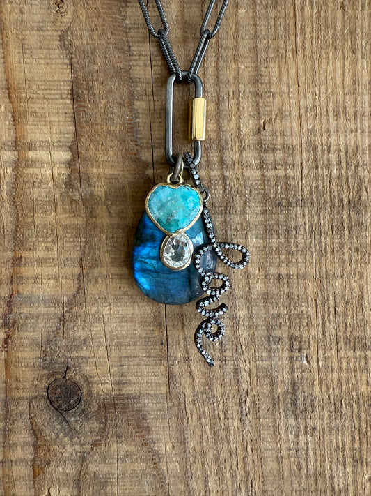 Rhodium sterling paperclip chain and carabiner clasp with turquoise and topaz, heart, and moon charms necklace.