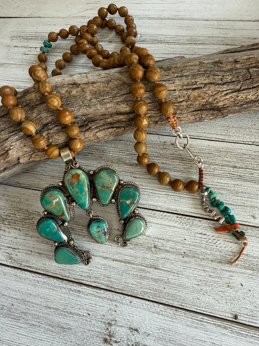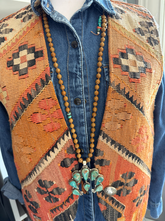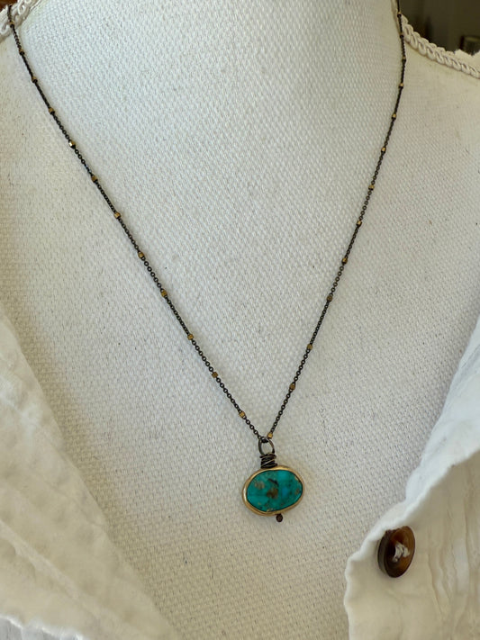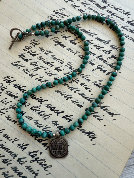 Tibetan charm on turquoise necklace. 16” with a fine silver toggle clasp.