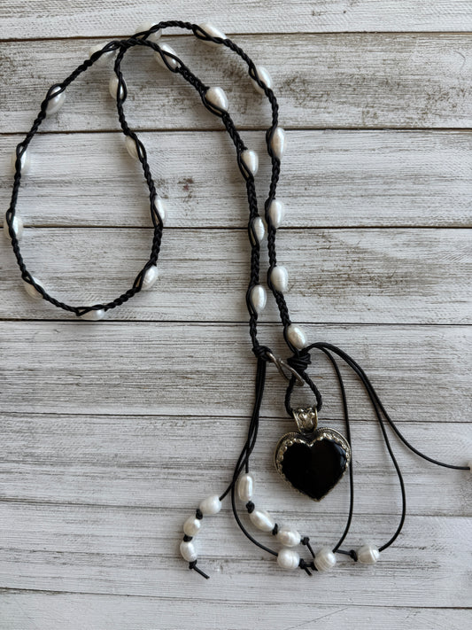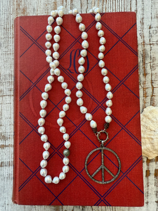 Diamond peace sign on hand knotted pearls necklace. 35”