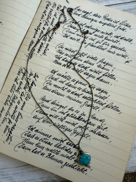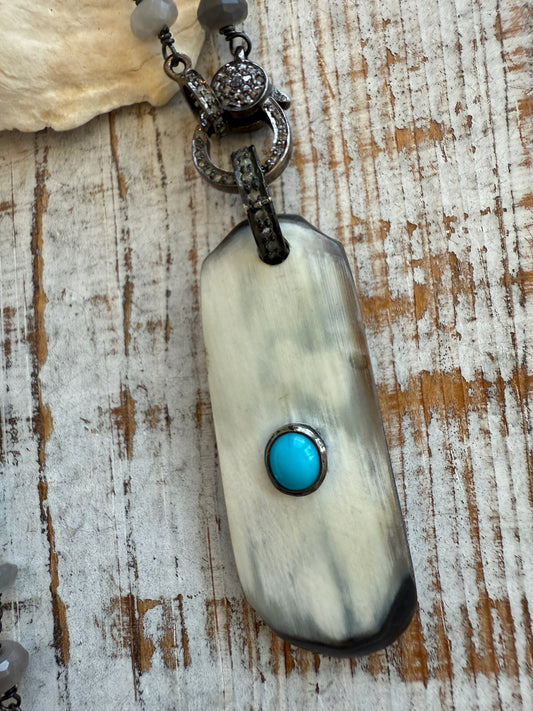 Bone pendant with turquoise on diamond bail/clasp on silverite chain necklace.