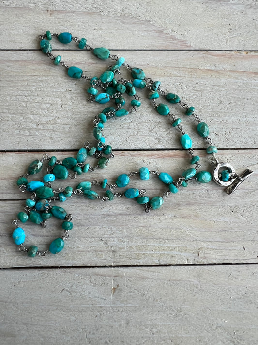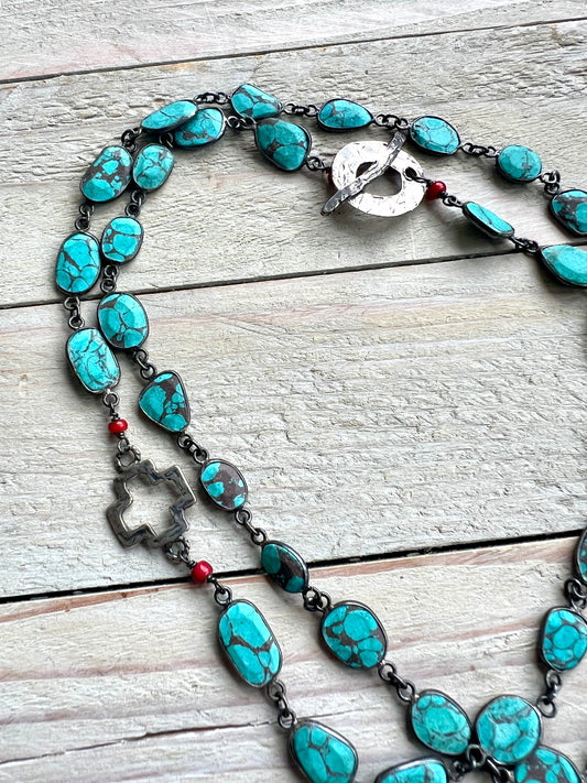 Gorgeous turquoise chain with hand made sterling open cross and toggle. 29”.