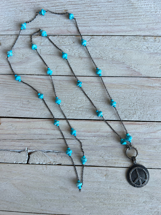 Pavé diamond peace sign on turquoise and sterling (oxidized) chain with sterling charm holder clasp. 36” necklace.