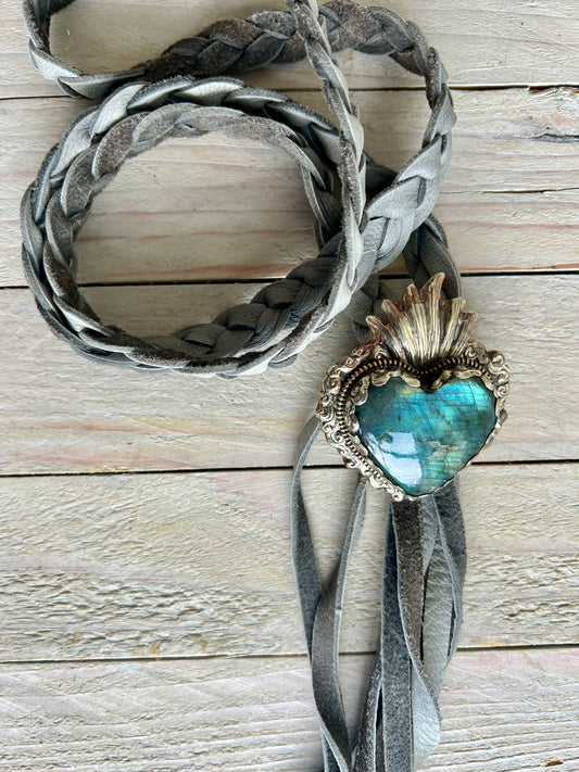 Tibetan labradorite heart on braided grey deerskin leather. Necklace Wear long or doubled. Boho chic. 37”.
