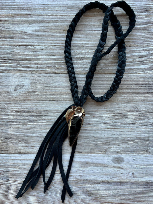 Tibetan black obsidian pendant on braided black deerskin leather. Wear long or short.
