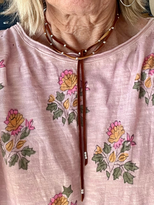 Thin deerskin “scarf” wrap necklace or bracelet with fine silver beads.