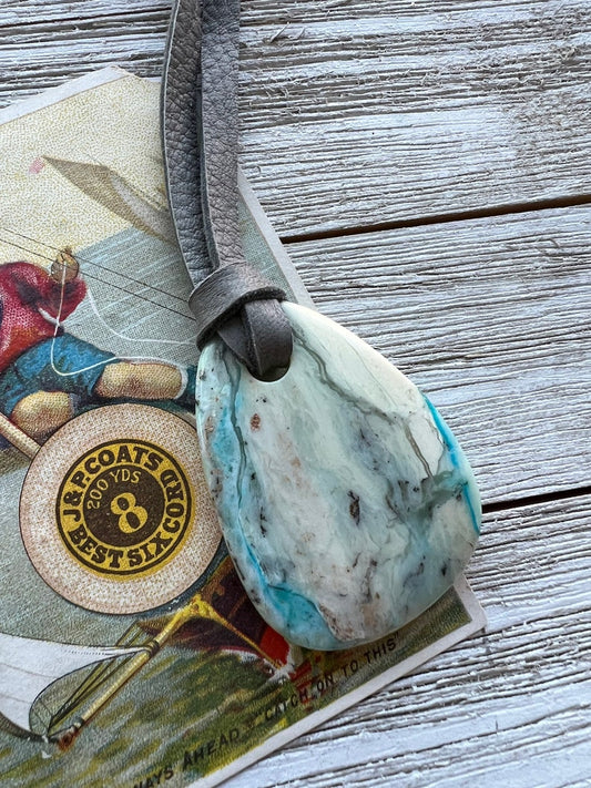 Turquoise pendant on grey deerskin leather with adjustable slider.