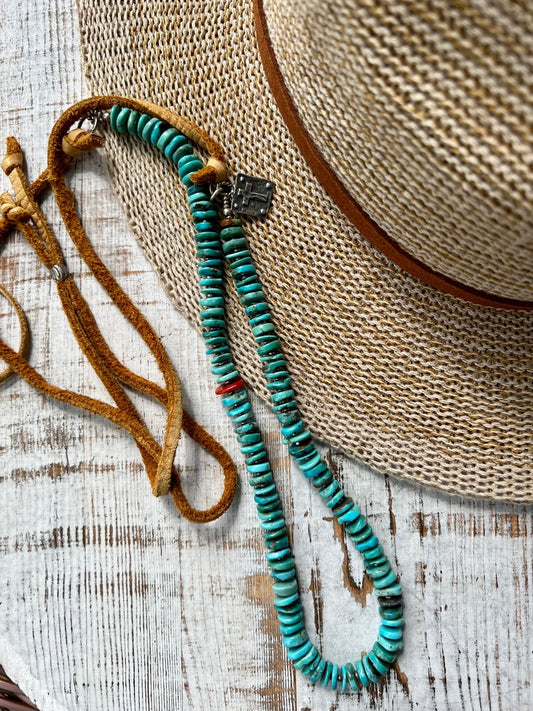Turquoise heishi beads with fine silver spacers and one coral bead on adjustable deerskin