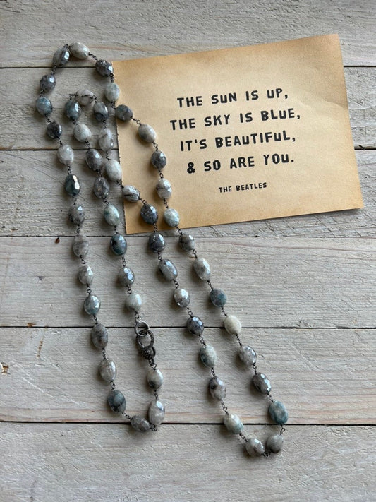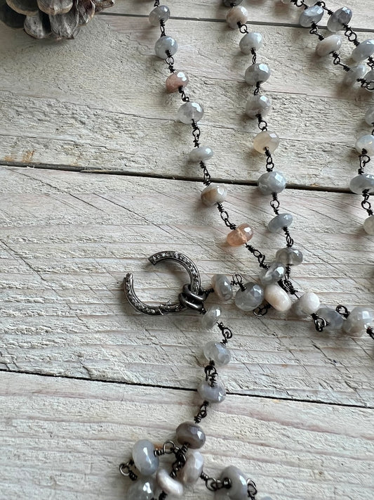 Pavé diamond trigger clasp on long silverite chain necklace. Blues, greys, and neutrals make this a versatile layering piece. 38” long. OOAK