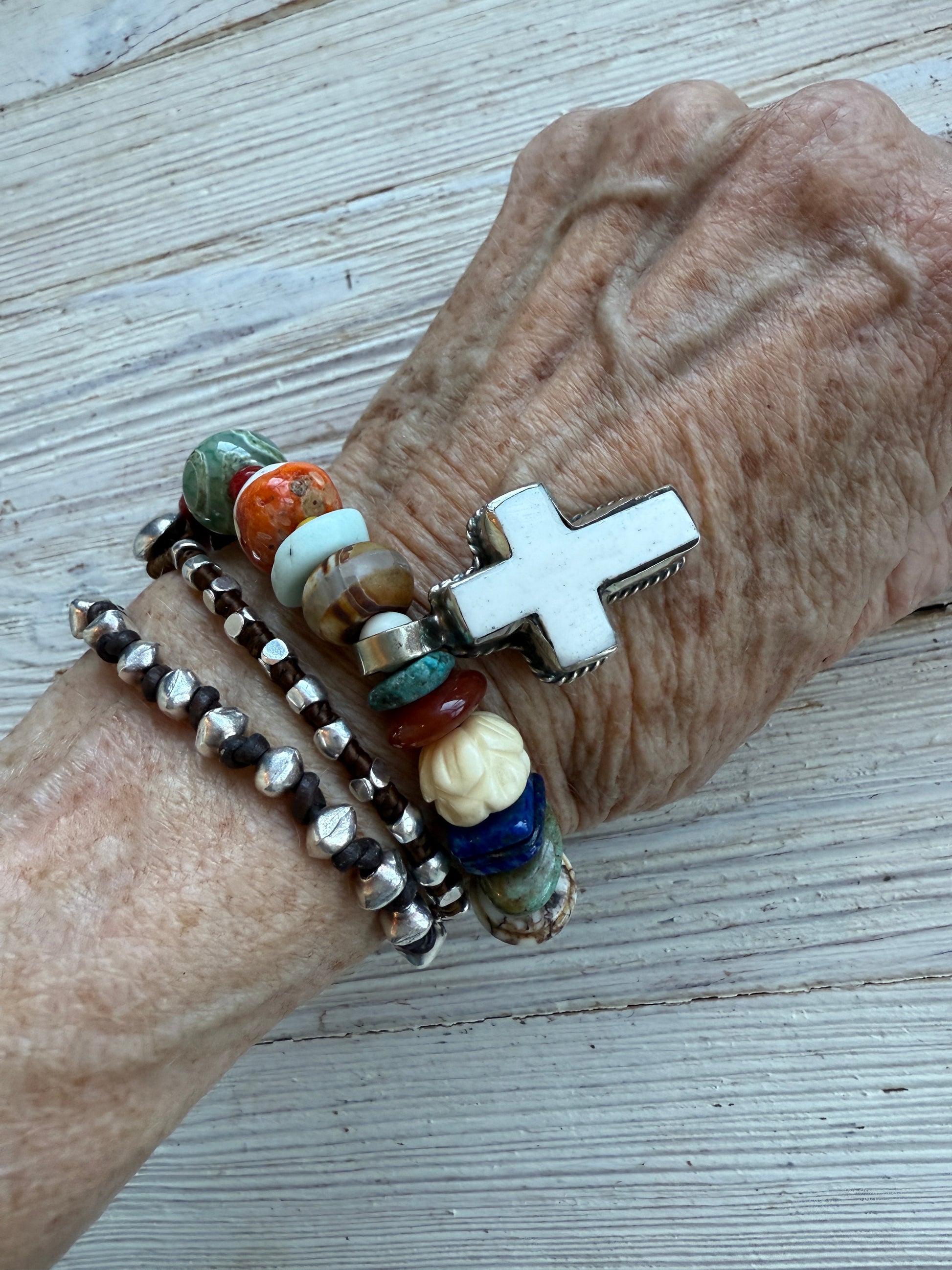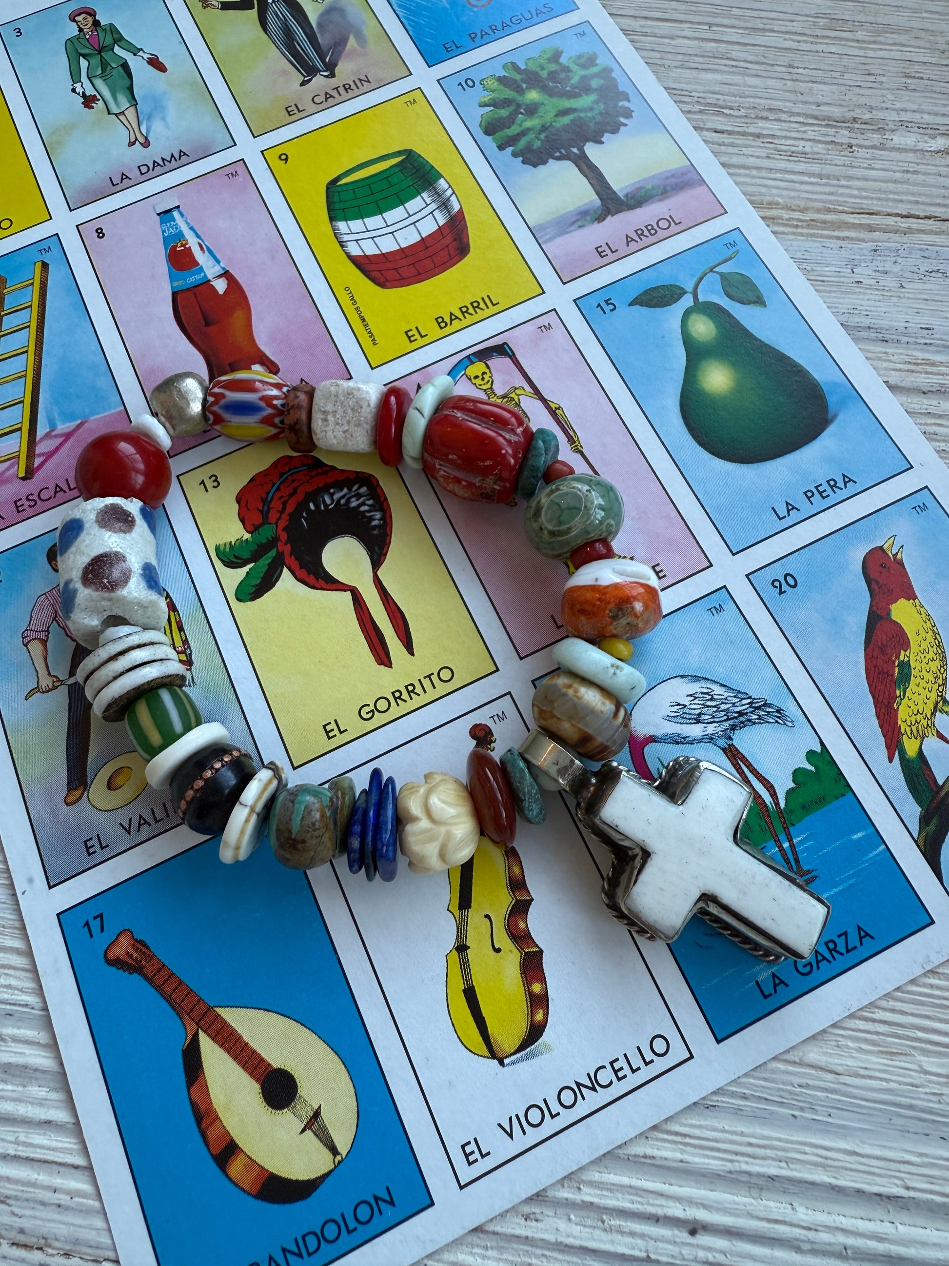 An assortment of gems, trade beads, and glass beads surround a bone cross from Tibet. 7” stack stretch bracelet.