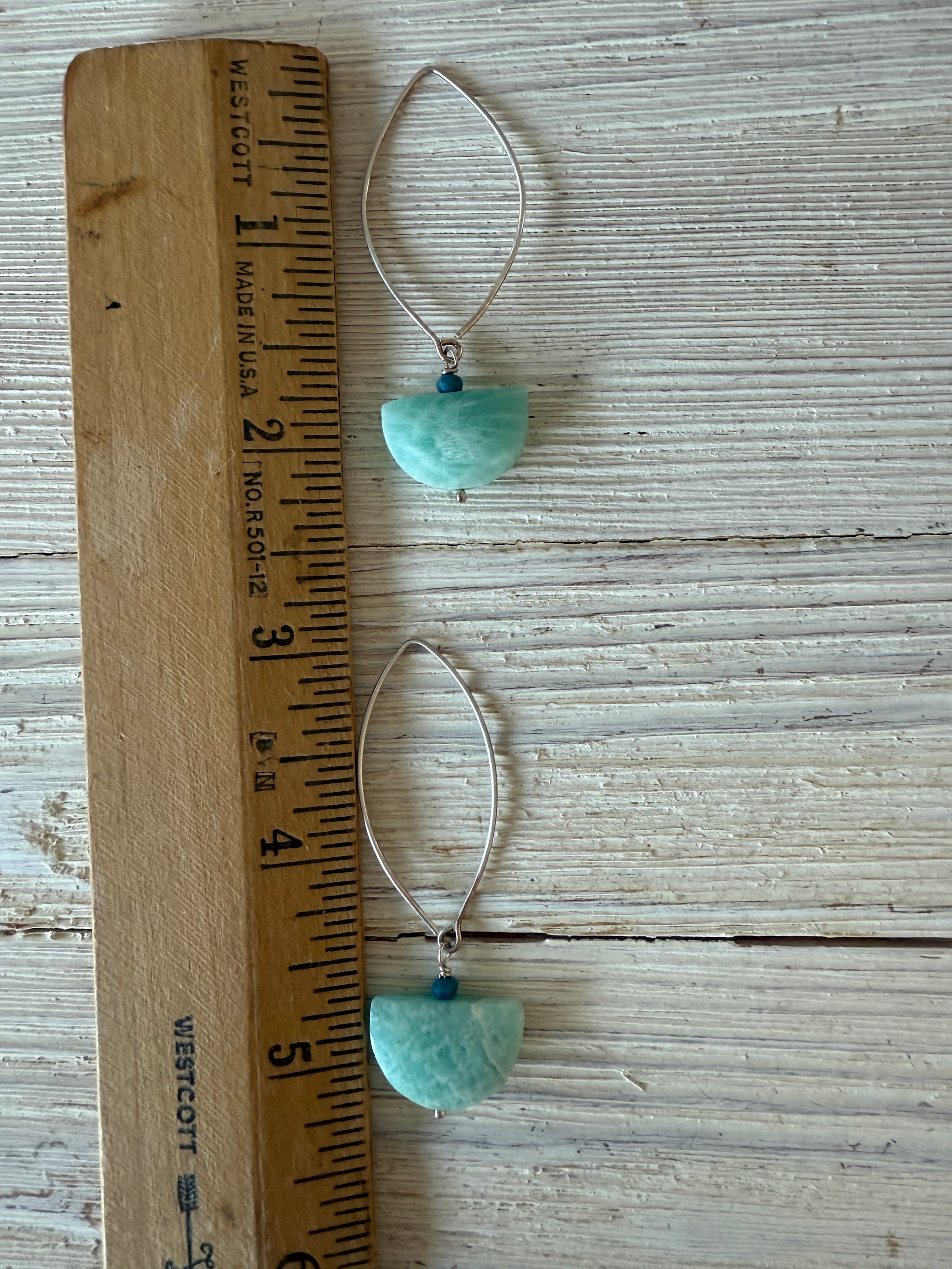 Half moons of Amazonite topped with a tiny faceted apatite bead and suspended from sterling silver ear wires. See photos for dimensions.