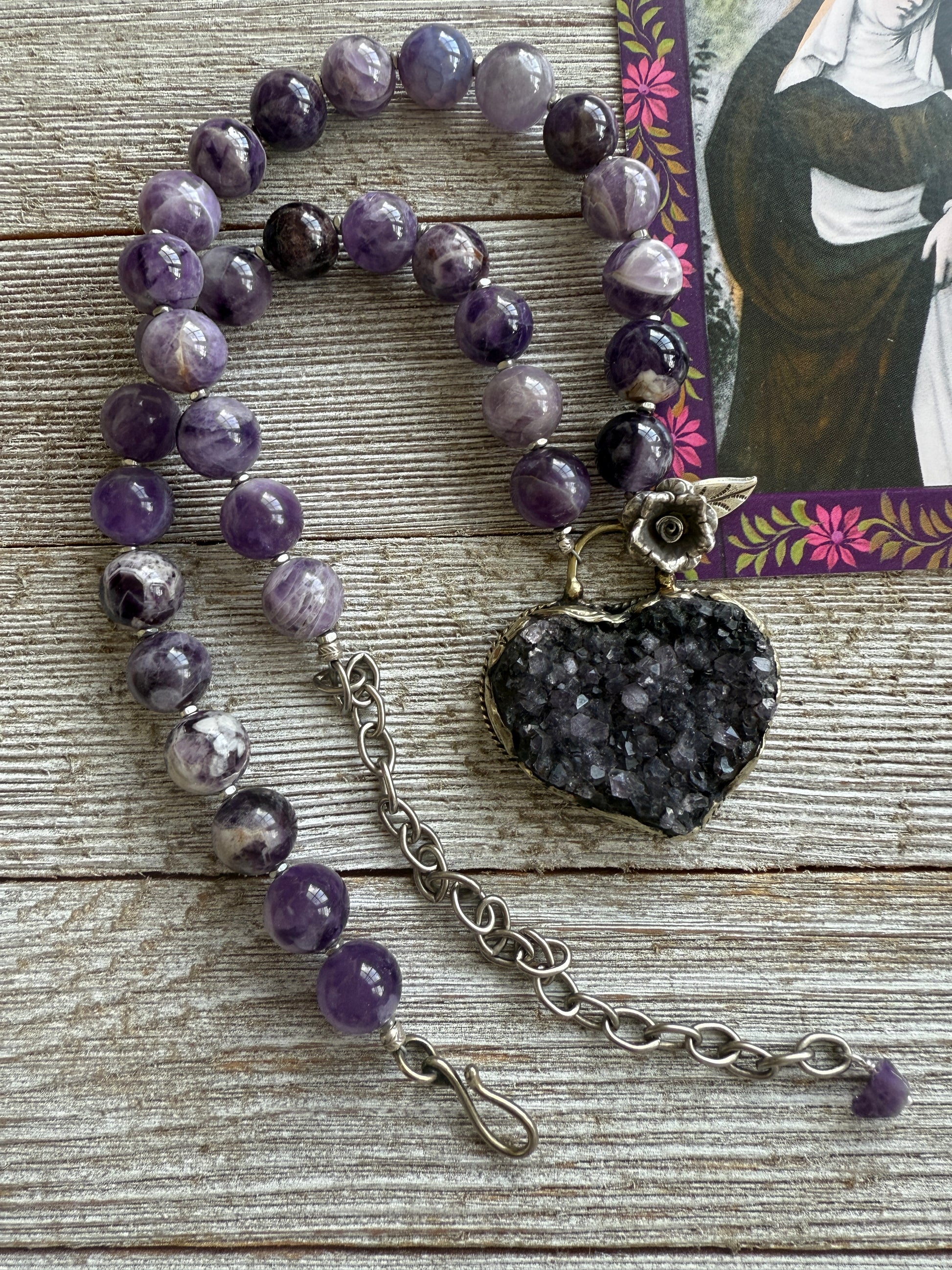 Tibetan Amethyst druzy heart pendant with fine silver flower and leaf accent is suspended from amethyst beads. White bronze hook closure and silver tone chain allow you to adjust from 18.5-24”. Pendant is just under 2” long and 1.75” wide.