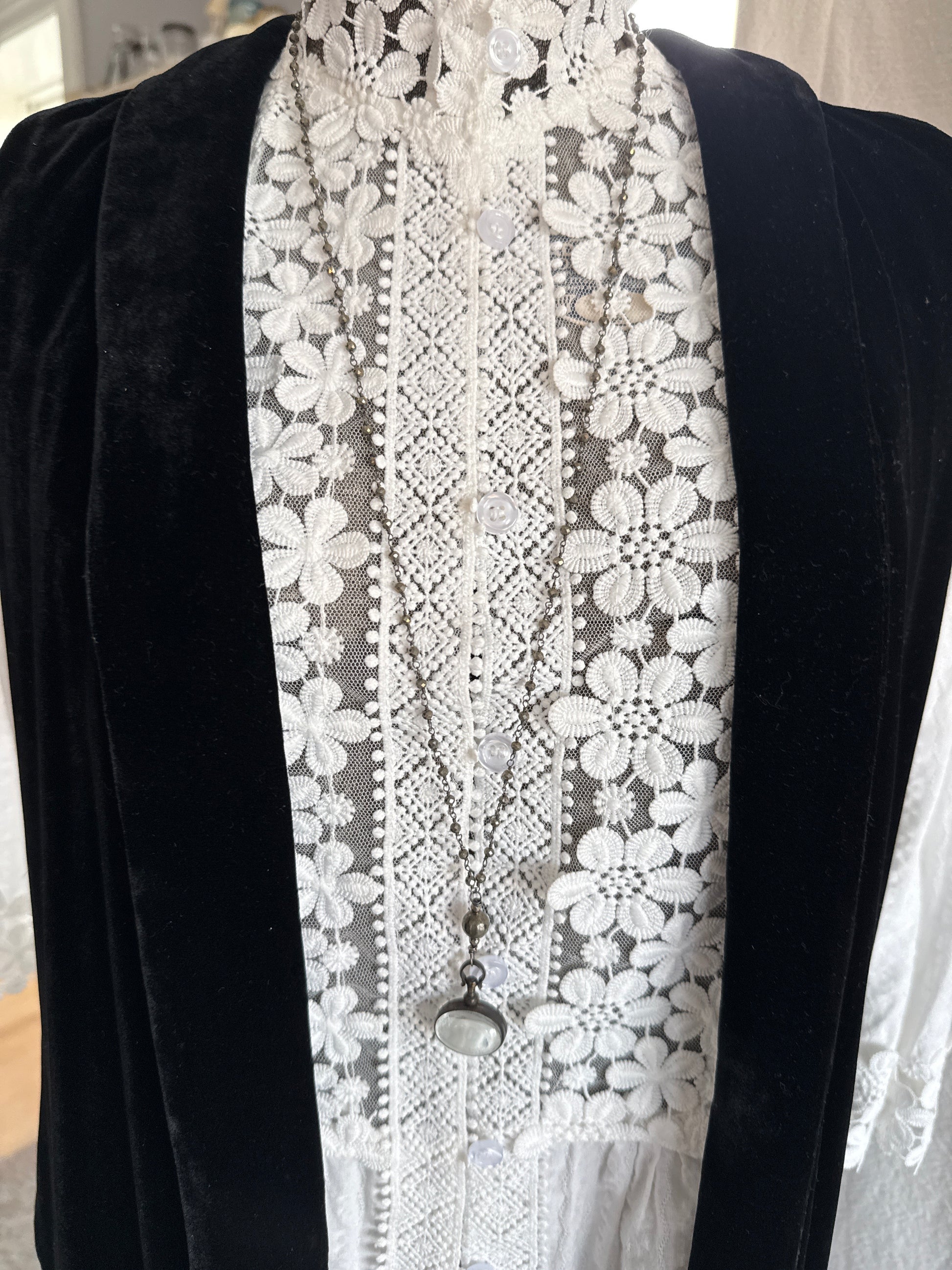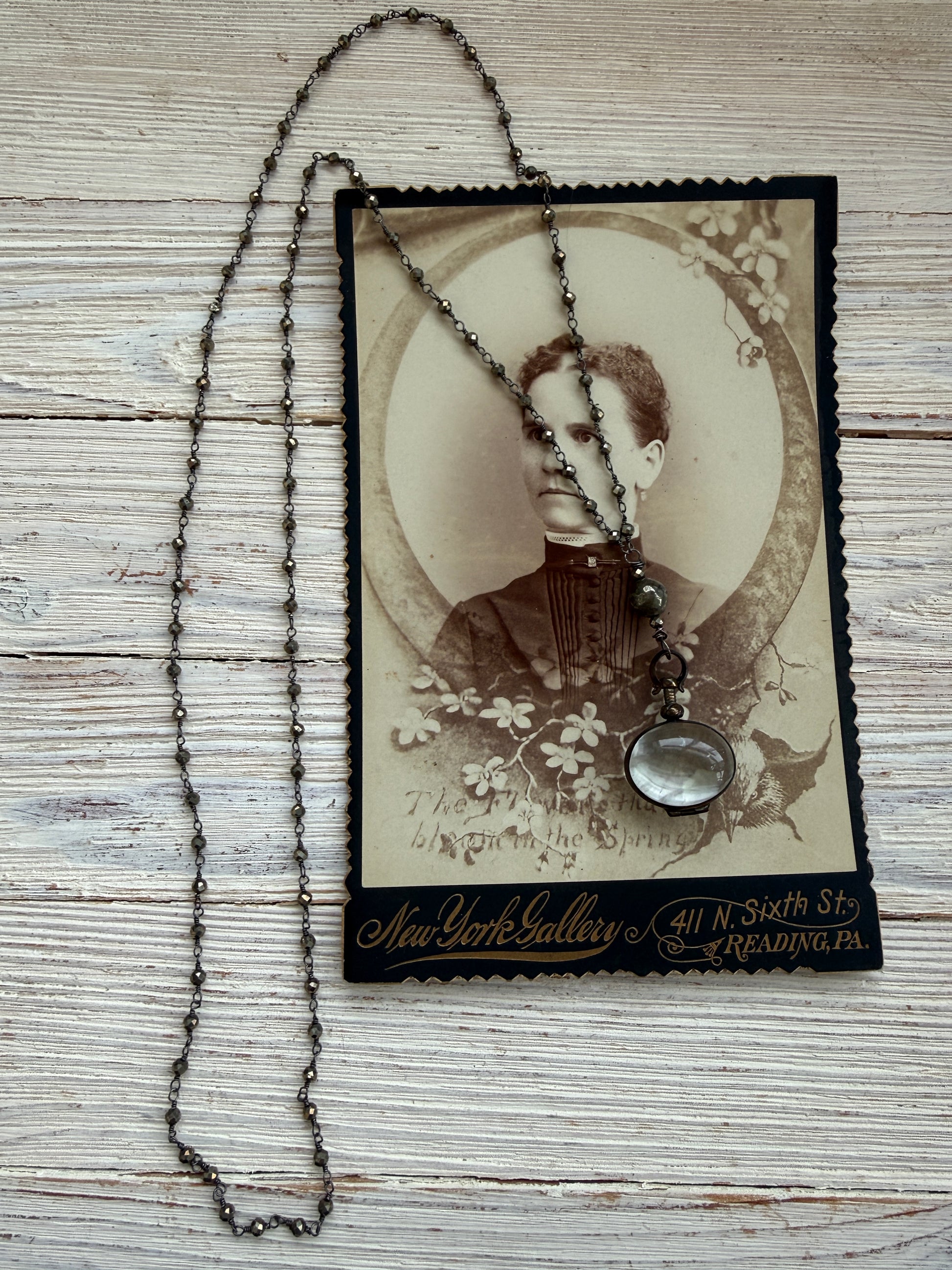 Antiqued bronze glass locket on pyrite chain. 32”