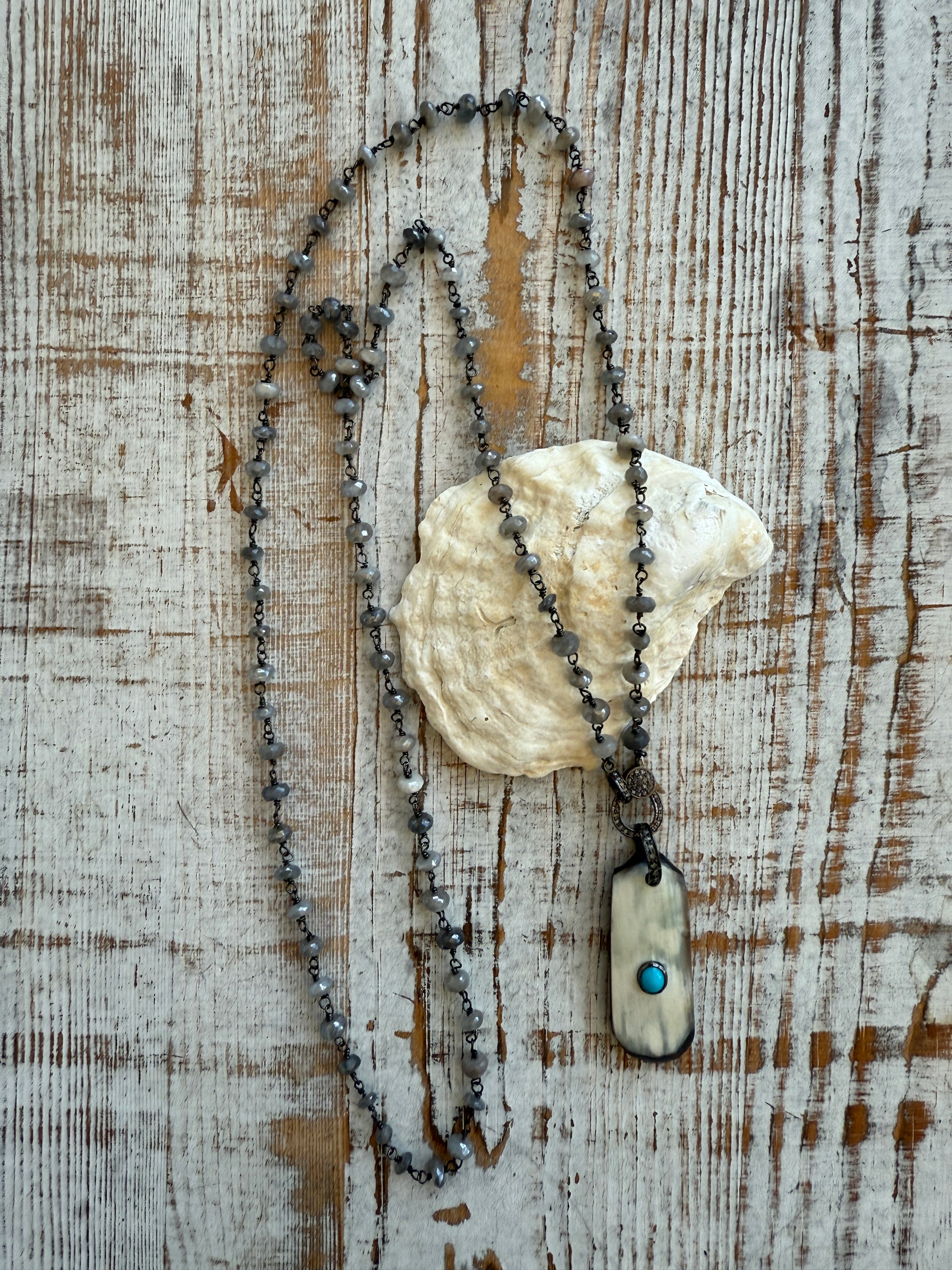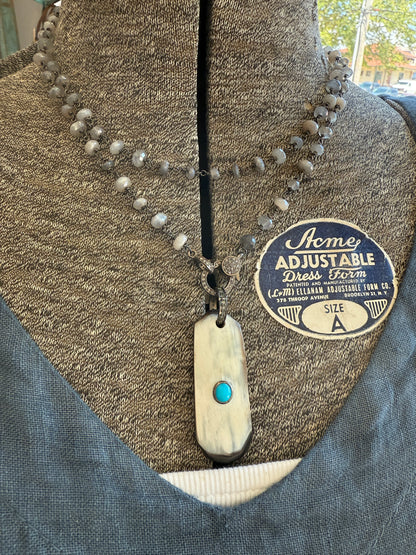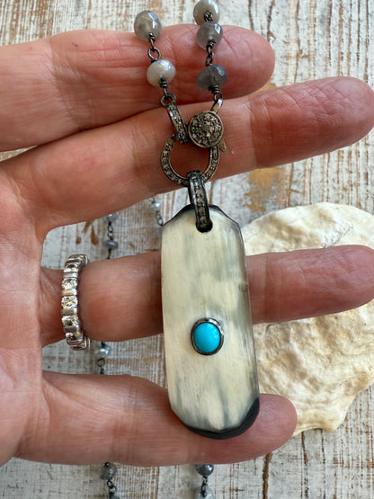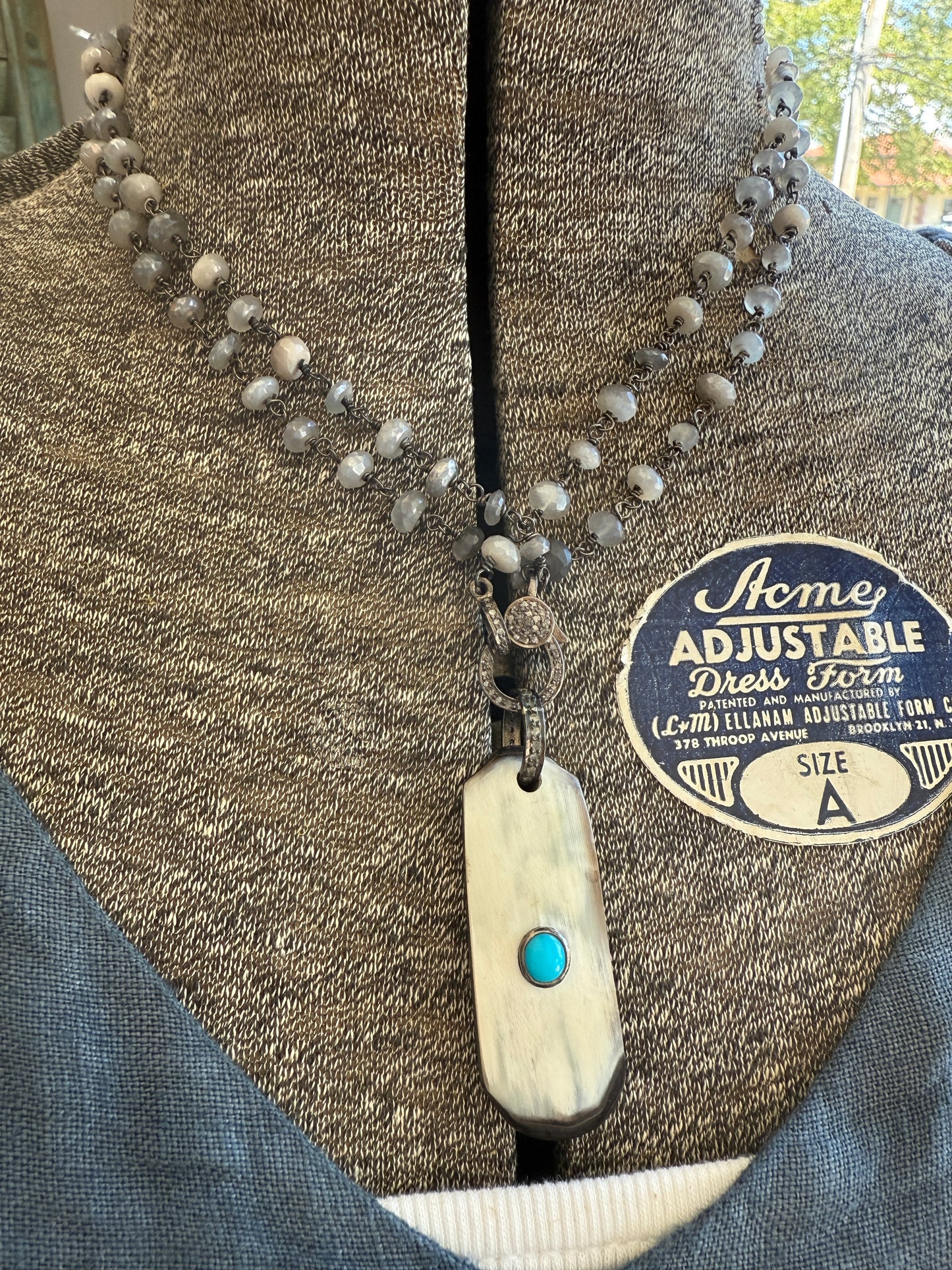 Bone pendant with turquoise on diamond bail/clasp on silverite chain necklace.