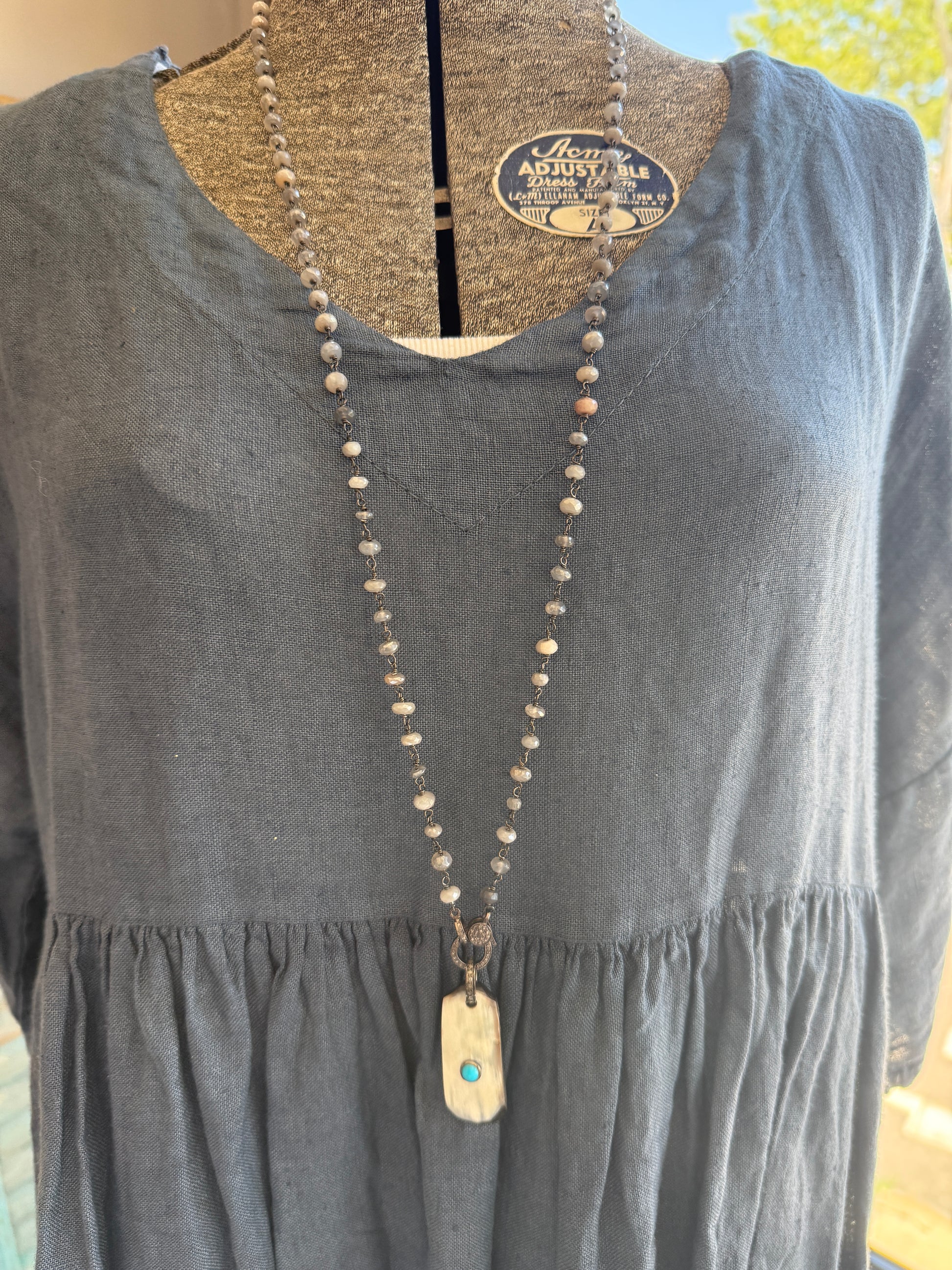 Earthy bone and turquoise pendant on diamond bale and clasp suspended from sterling and silverite chain. Chain and clasp are 35” and pendant adds another 2”. This combo is stunning-organic, earthy, and luxurious! You can also remove the pendant and wear just the chain or add your own pendant for a whole new look!
