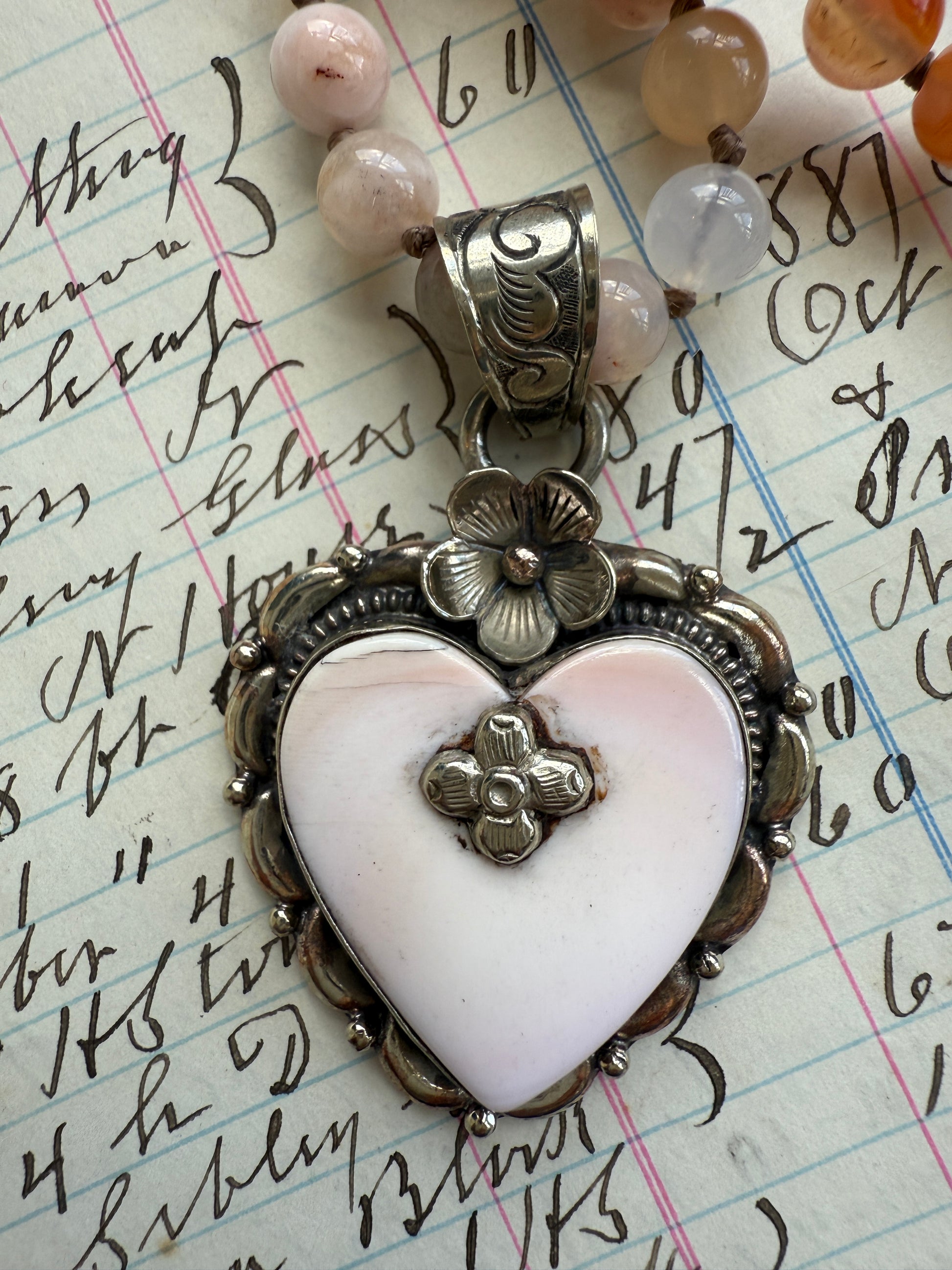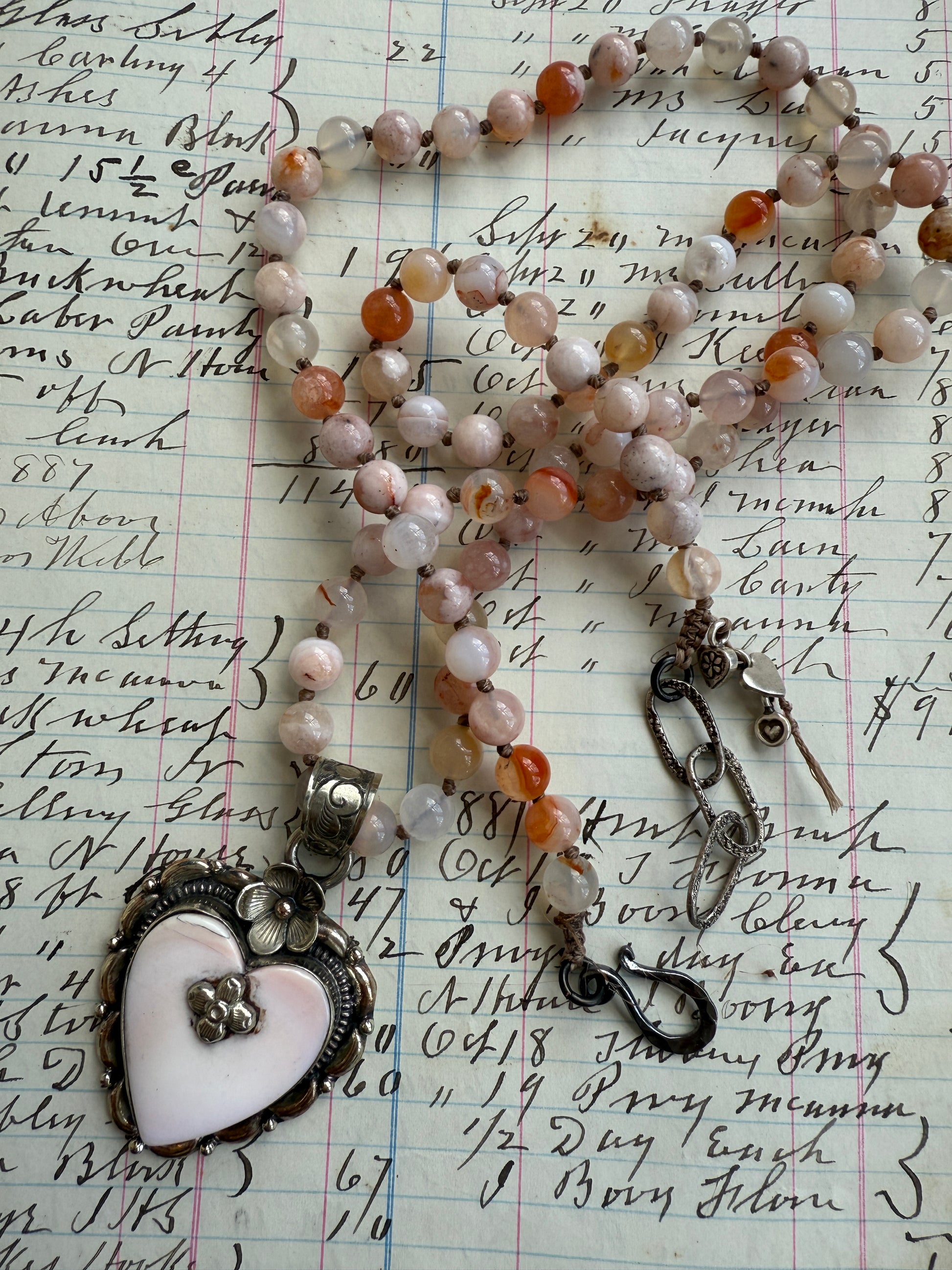 Cherry blossom agates are hand knotted to hold a pink Peruvian Opal Tibetan heart (removable). Necklace is 32.5-34.5” so it can be worn doubled, long, and with or without the pendant. Repousé flower on back of pendant allow you to wear opal side or silver side out. I’ve added a hook and chain to allow you to adjust it for layering.