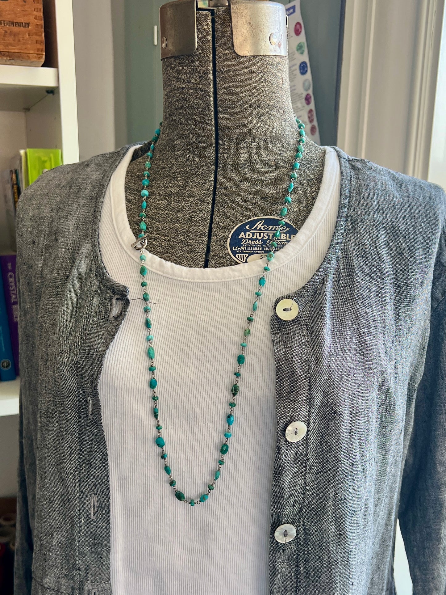 Turquoise stones are wire wrapped with sterling in this 32” long necklace. Can be worn as a great layering piece or solo long or doubled. Fine silver toggle clasp.