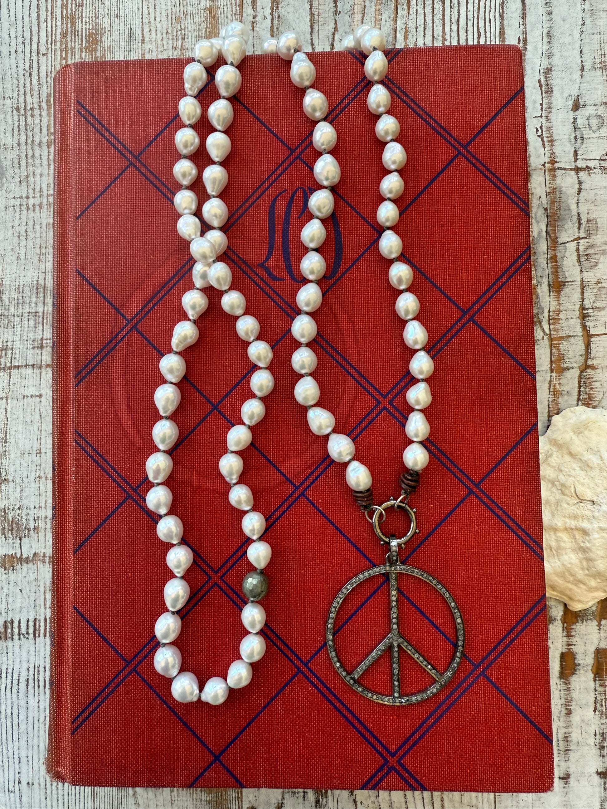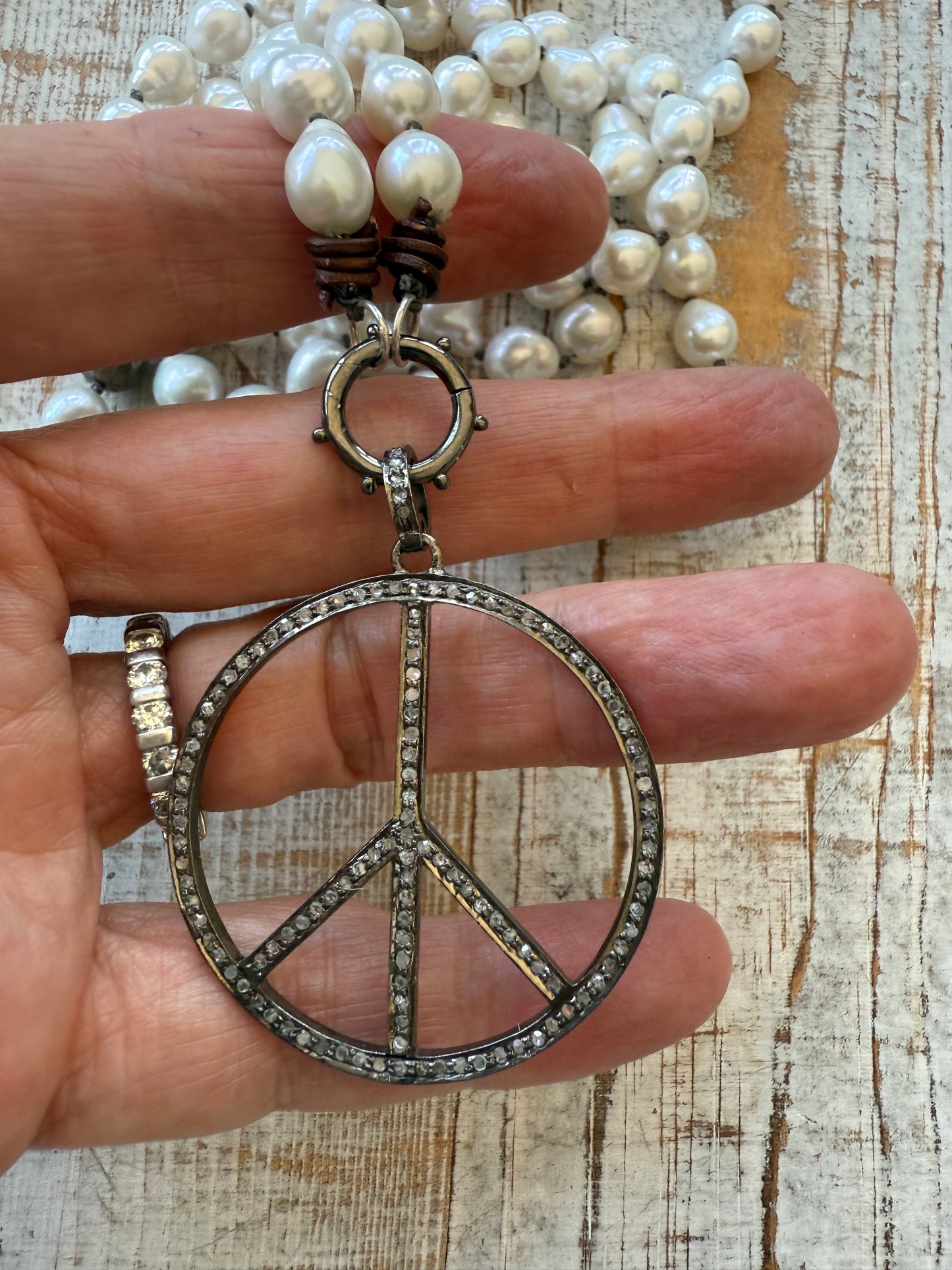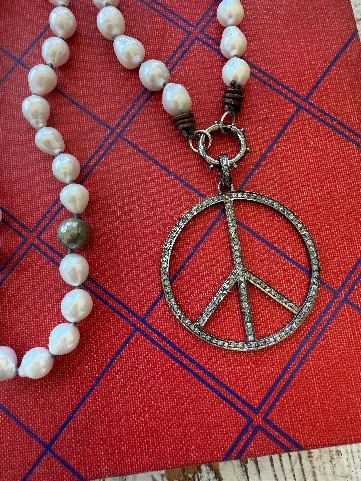 Large pavé diamond peace sign on hand knotted white teardrop pearls. 35”. Sterling ring clasp holds pendant and allows you to just wear the pearls or add a pendant of your own.