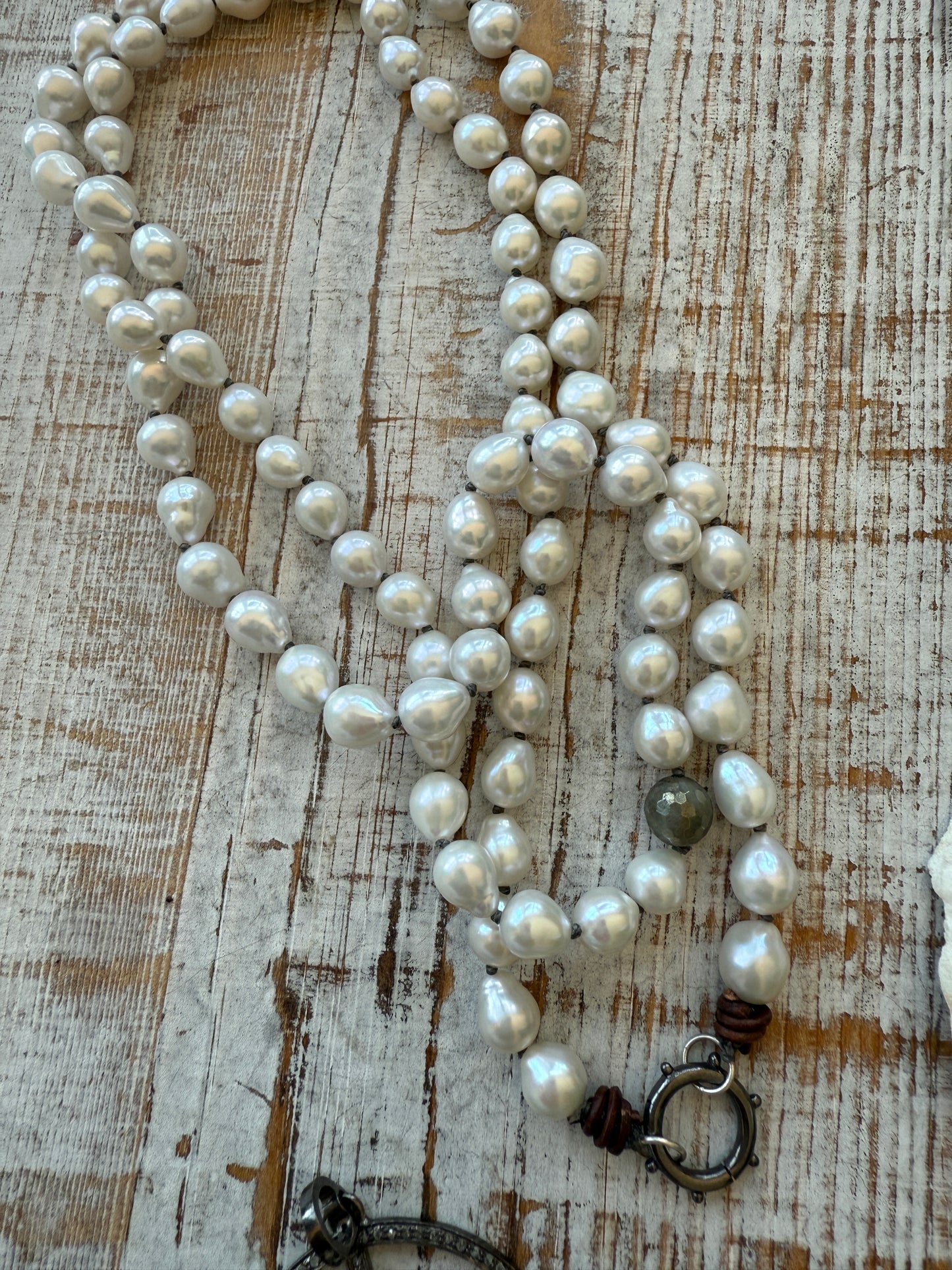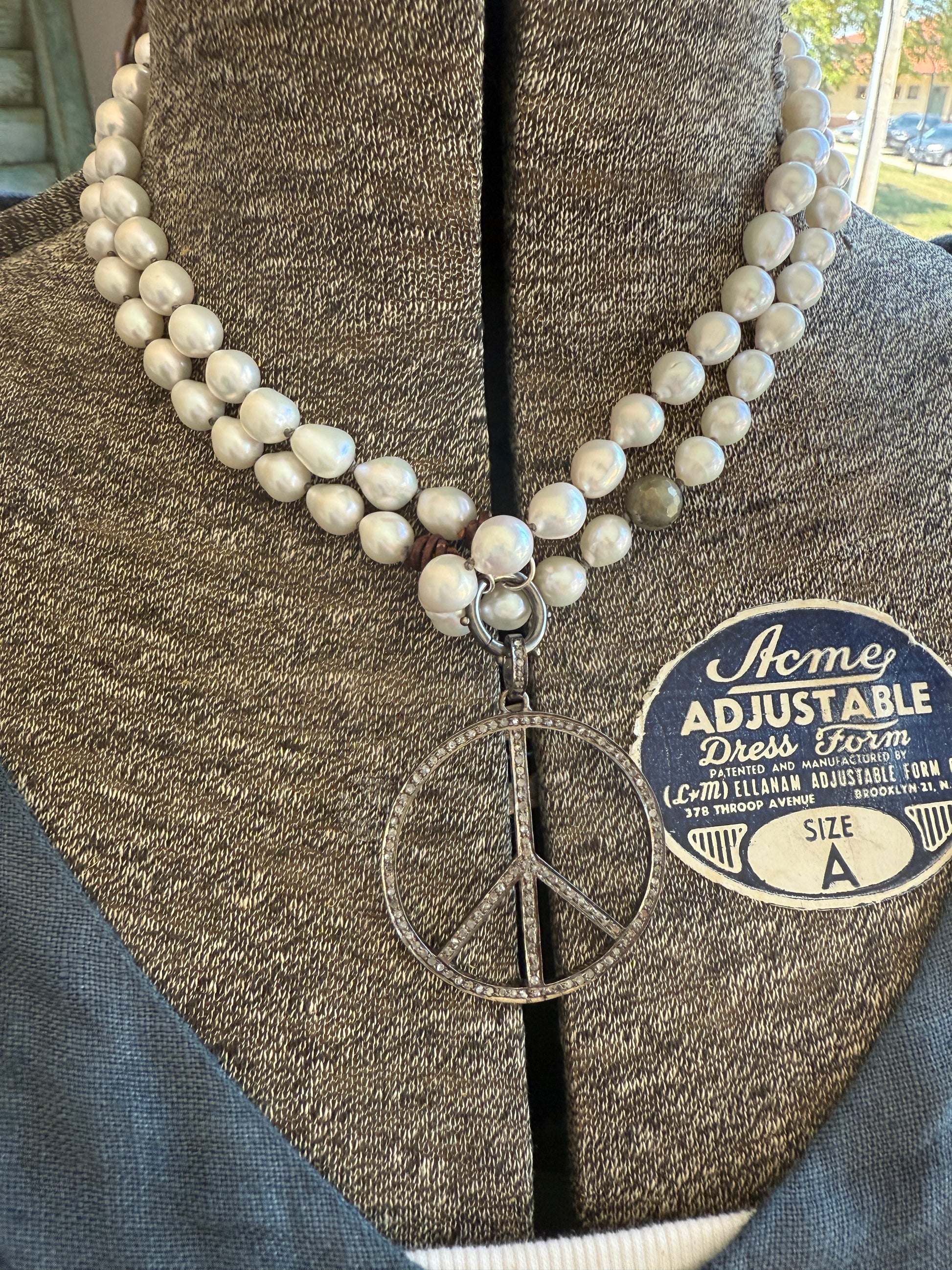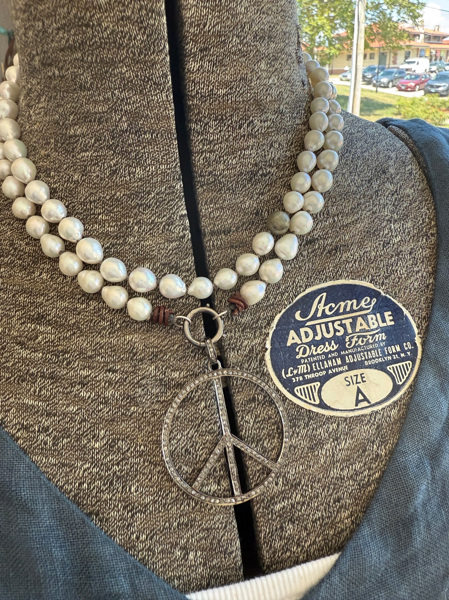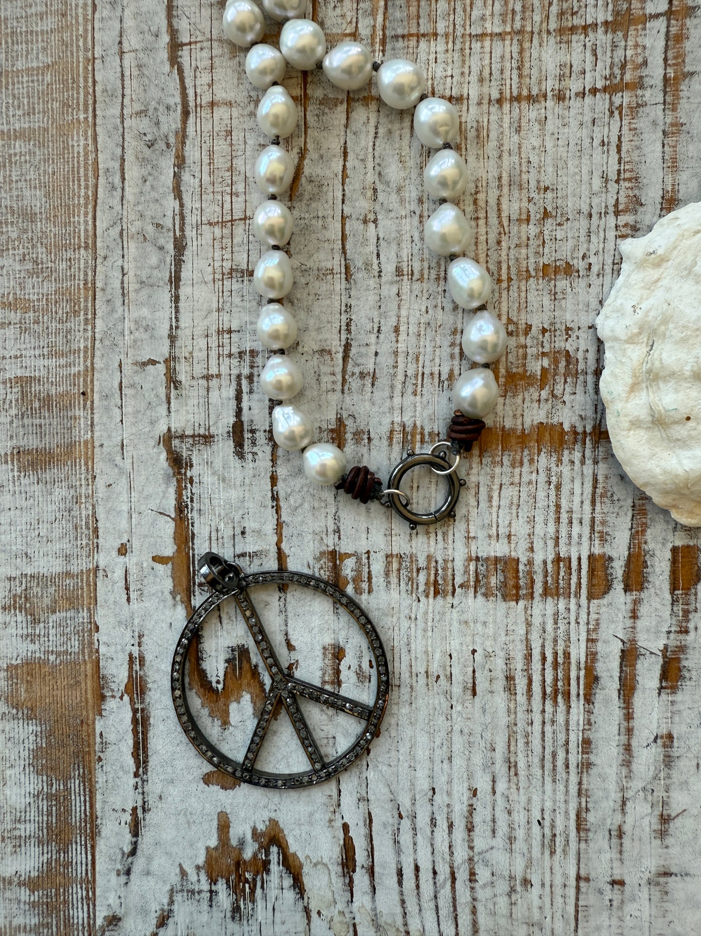Large pavé diamond peace sign on hand knotted white teardrop pearls. 35”. Sterling ring clasp holds pendant and allows you to just wear the pearls or add a pendant of your own.