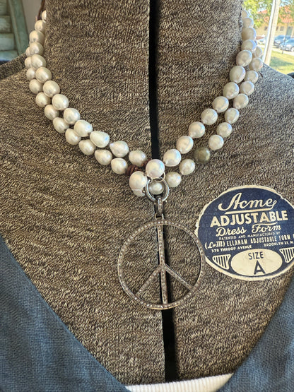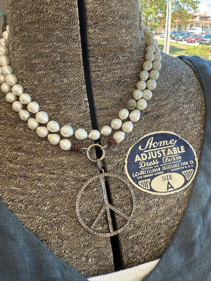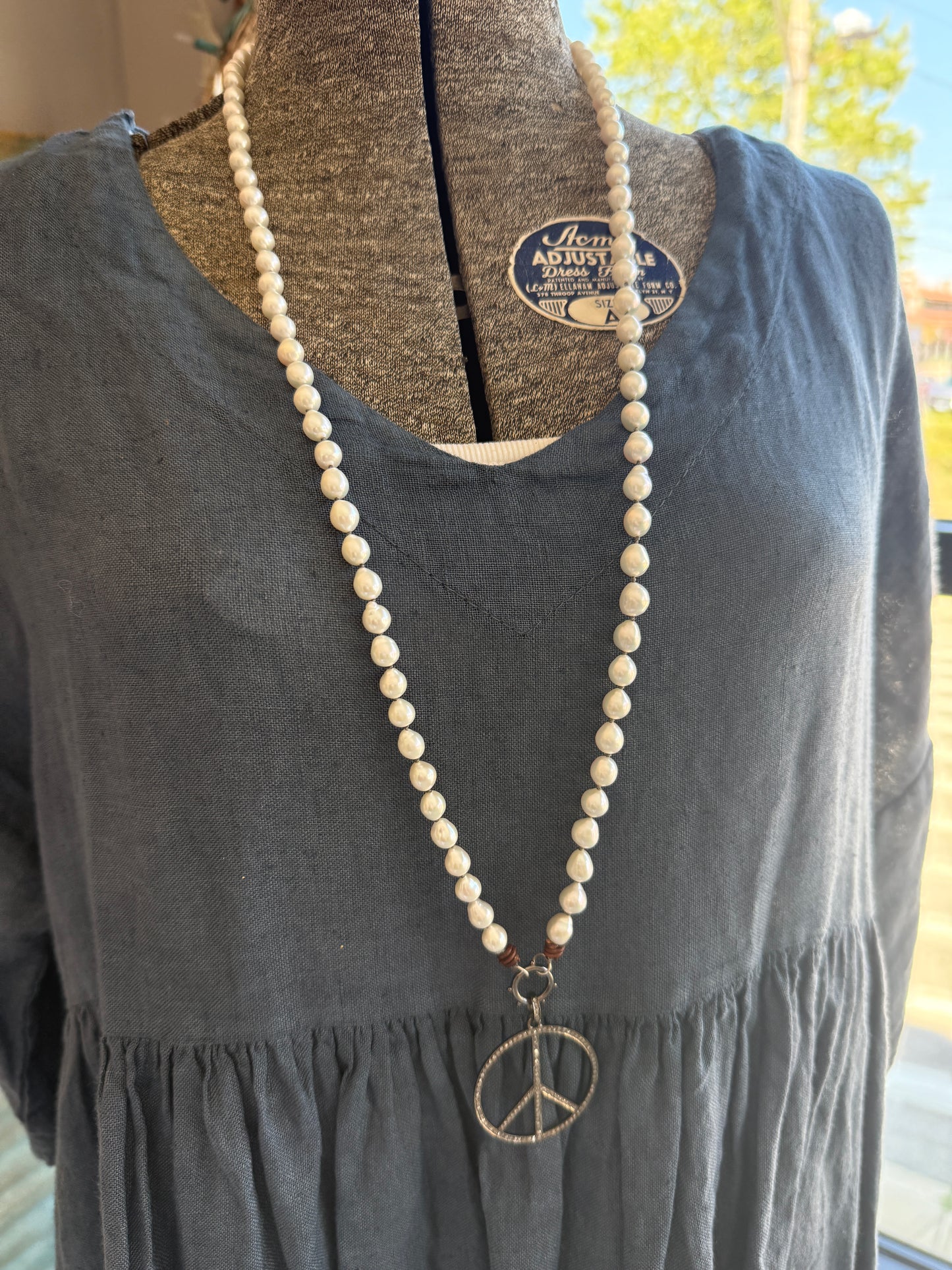 Diamond peace sign on hand knotted pearls necklace. 35”