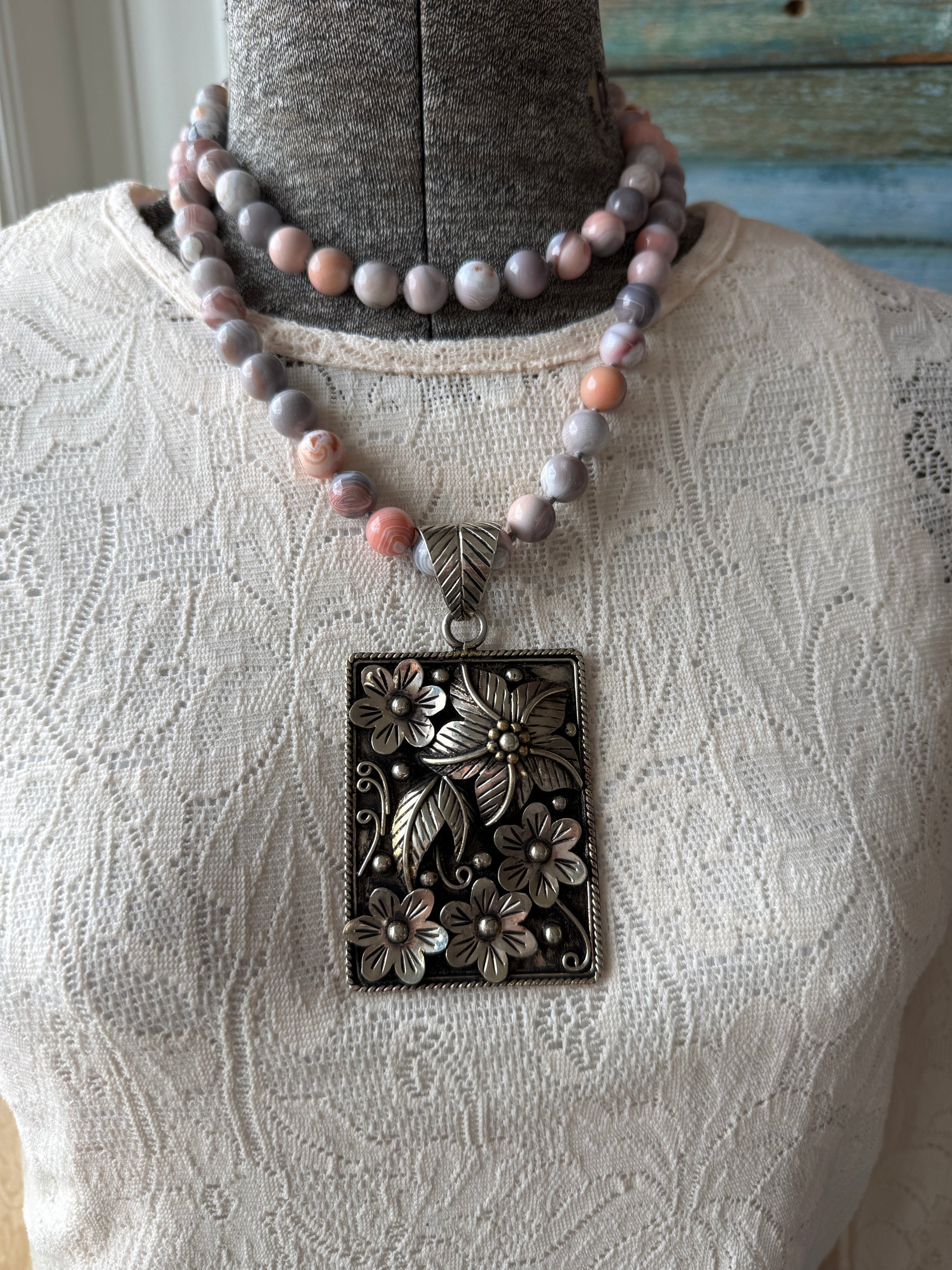 Beautiful Tibetan statement silver flower pendant hangs from hand knotted Botswana agates in pinks, greys, salmon and Carmel tones. Pendant can be removed so you can wear just the beads also. Pair this with a chunky sweater, white blouse, or black turtleneck and you are good to go! Pendant is 3.5” including the bale and knotted bead strand is 35.5” long. Wearing or short and not or without the pendant.