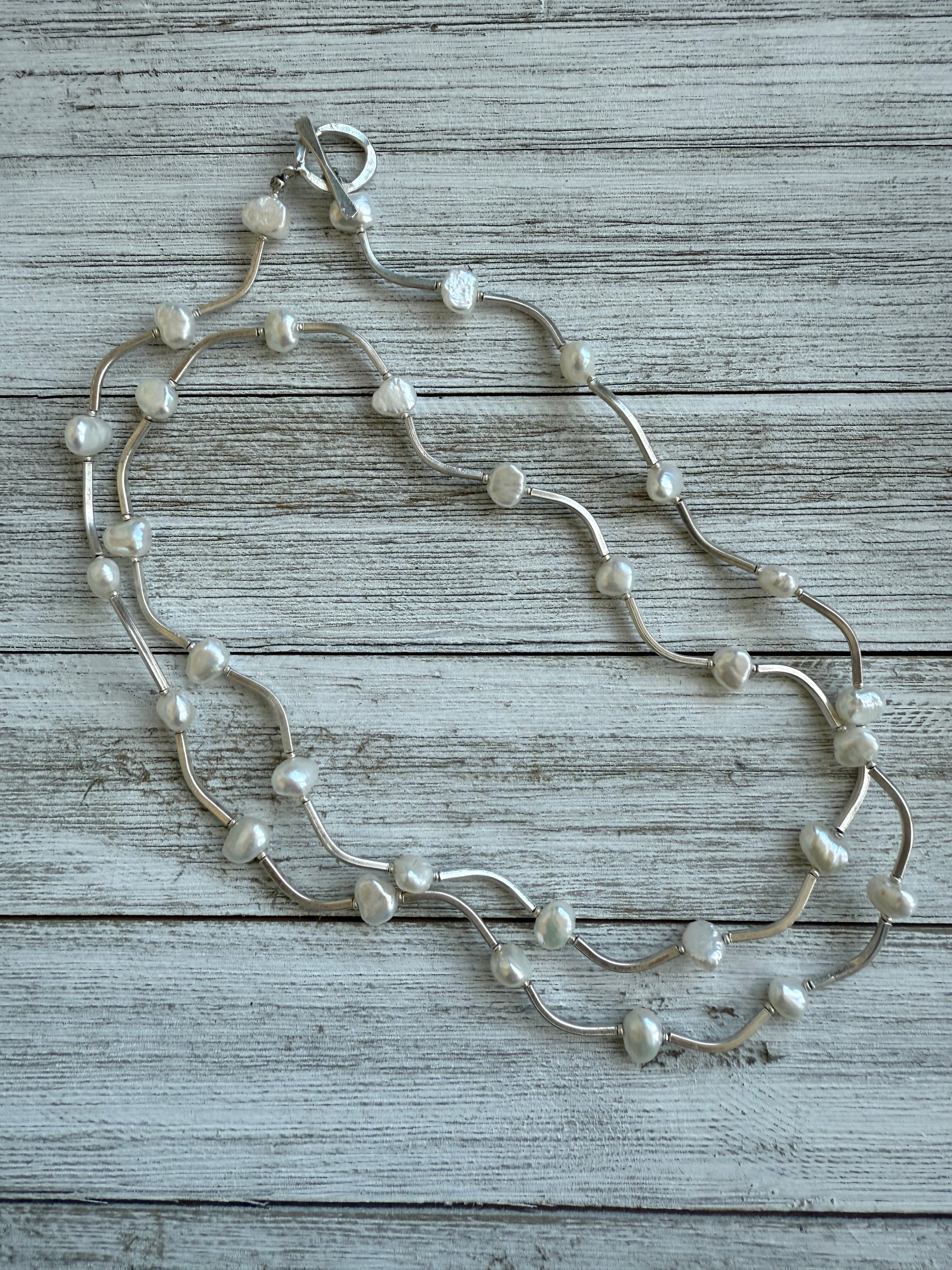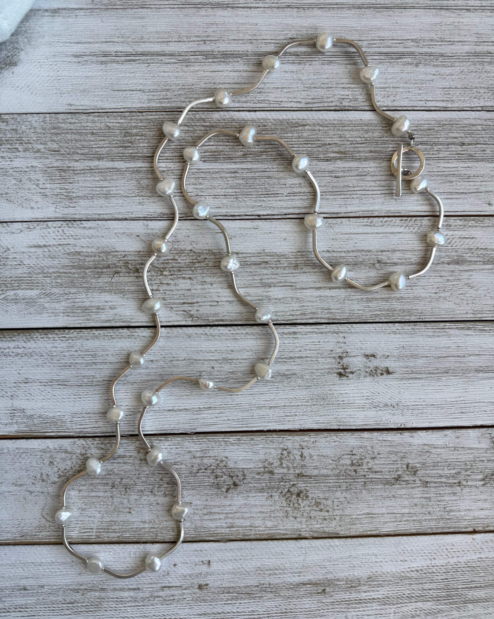 Fine silver “noodle” beads dotted with white pearls. Wear long or doubled. Fine silver toggle clasp also looks great off to the side. 35.75”