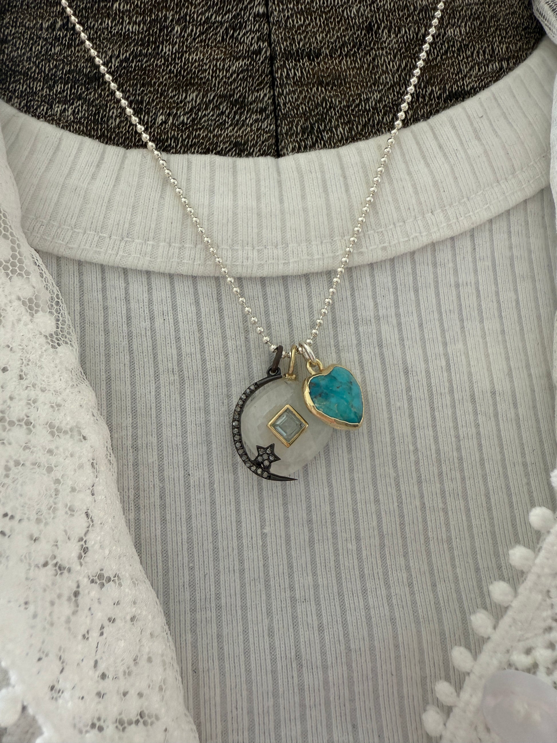 Moonstone and blue topaz charm with a diamond pavé crescent moon and star, sit beside a turquoise heart. All gathered on sterling silver ball chain. 18”